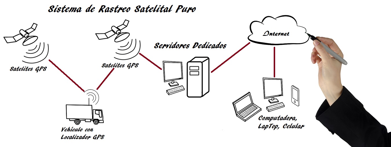 El sistema de rastreo satelital puro, maneja en su esquema una combinación similar a los anteriores mencionados en otras secciones, este detecta la señal de los satélites orbitando la tierra, una vez obtenida esta información, el mismo dispositivo renvía esta información en esta ocasión a satélites que orbitan también la tierra, sin necesidad de antenas celulares o repetidoras.